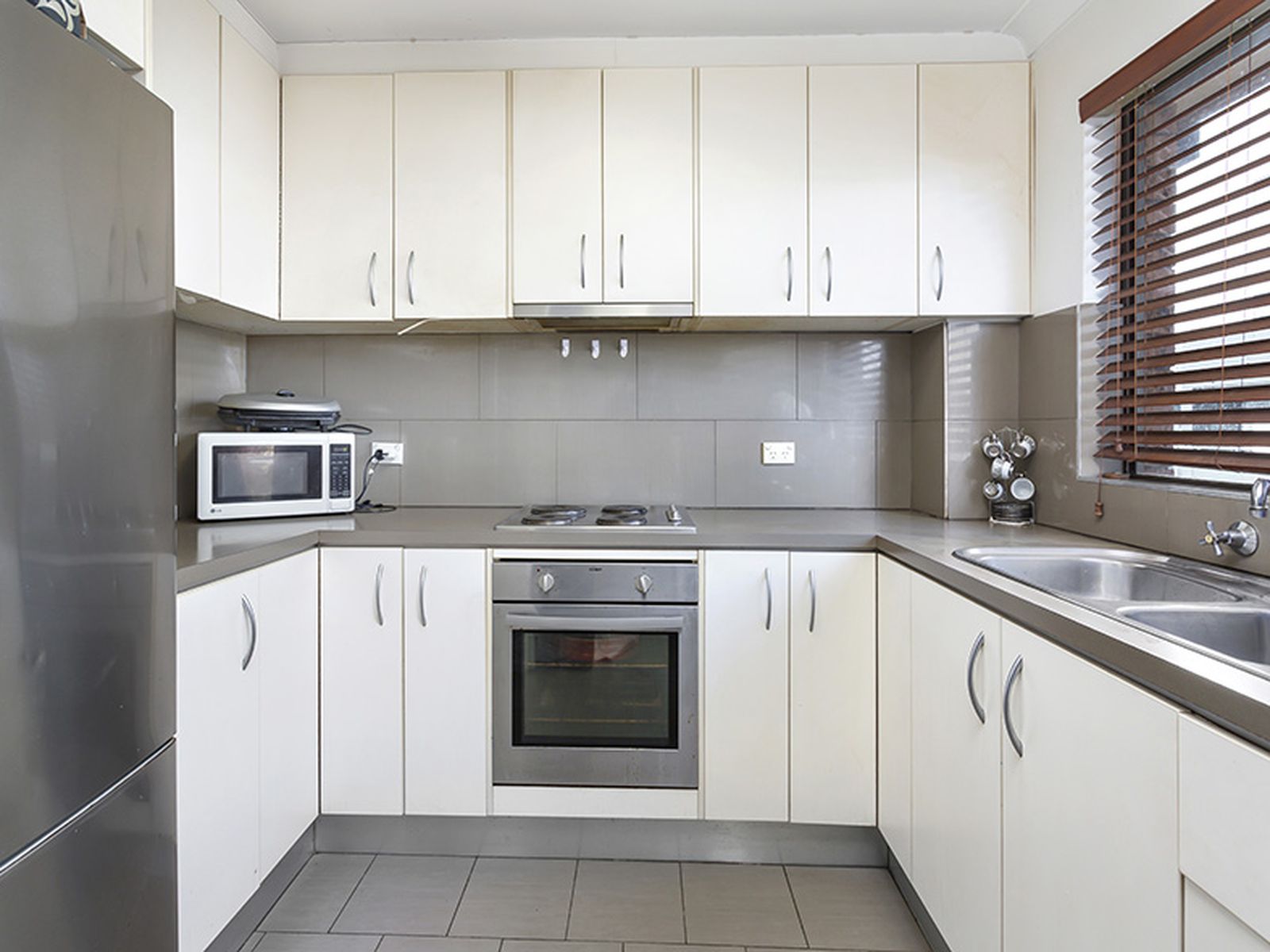 - Kitchen features electric cook top with plenty of storage.